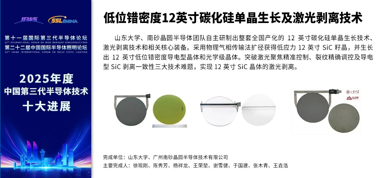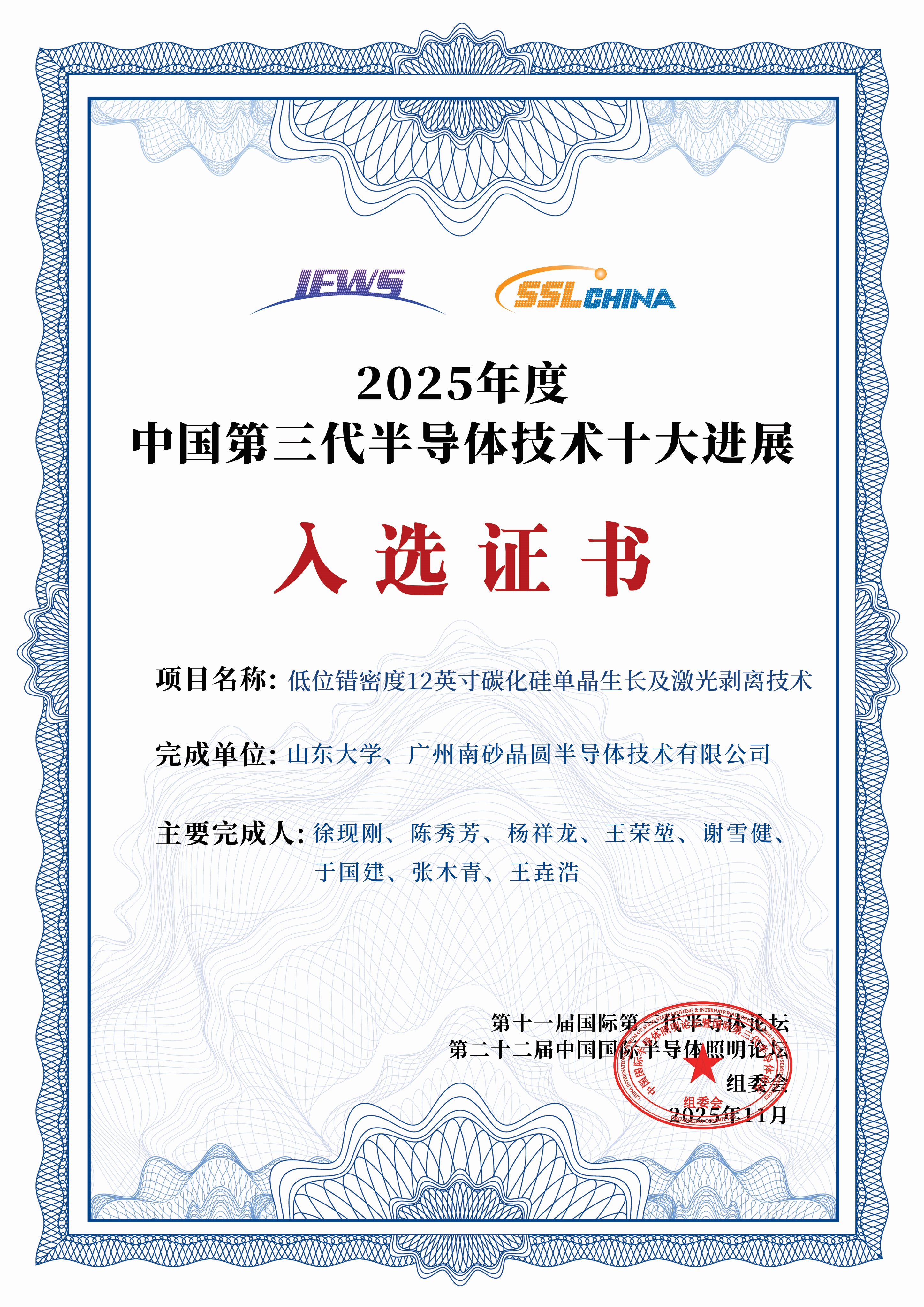 11月12日,第十一届国际第三代半导体论坛&第二十二届中国国际半导体照明论坛在厦门开幕,山东大学“低位错密度12英寸碳化硅单晶生长及激光剥离技术”入选“2025年度中国第三代半导体技术十大进展”。