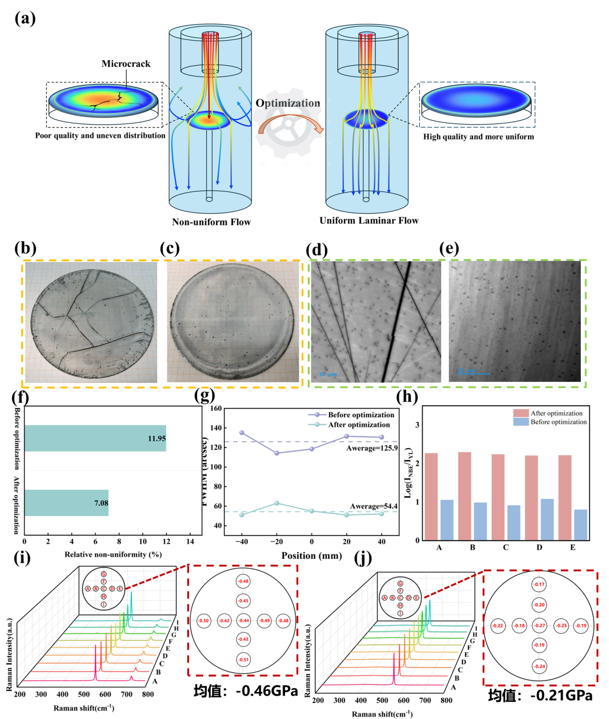 图:(a)基于CFD仿真的垂直HVPE反应室流场优化示意图,(b)优化前(c)优化后的GaN晶体光学图片,(d)优化前和(e)优化后GaN的表面CL图像(f)优化前后直径方向五点厚度分布以及(g)相对不均匀性,(h)优化后后GaN五点(A-E)PL图谱五点对应的INBE/IYL对数比值对比,(i)优化前和(j)优化后GaN九点(A-I)Raman图谱以及通过九点对应的E2(High)偏移计算出的表面应力分布。