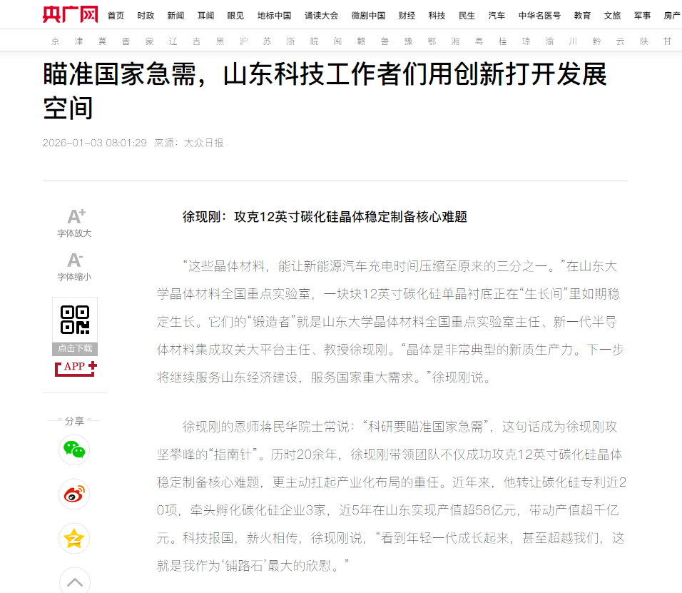徐现刚的恩师蒋民华院士常说:“科研要瞄准国家急需”,这句话成为徐现刚攻坚攀峰的“指南针”。历时20余年,徐现刚带领团队不仅成功攻克12英寸碳化硅晶体稳定制备核心难题,更主动扛起产业化布局的重任。近年来,他转让碳化硅专利近20项,牵头孵化碳化硅企业3家,近5年在山东实现产值超58亿元,带动产值超千亿元。科技报国,薪火相传,徐现刚说,“看到年轻一代成长起来,甚至超越我们,这就是我作为‘铺路石’最大的欣慰。”